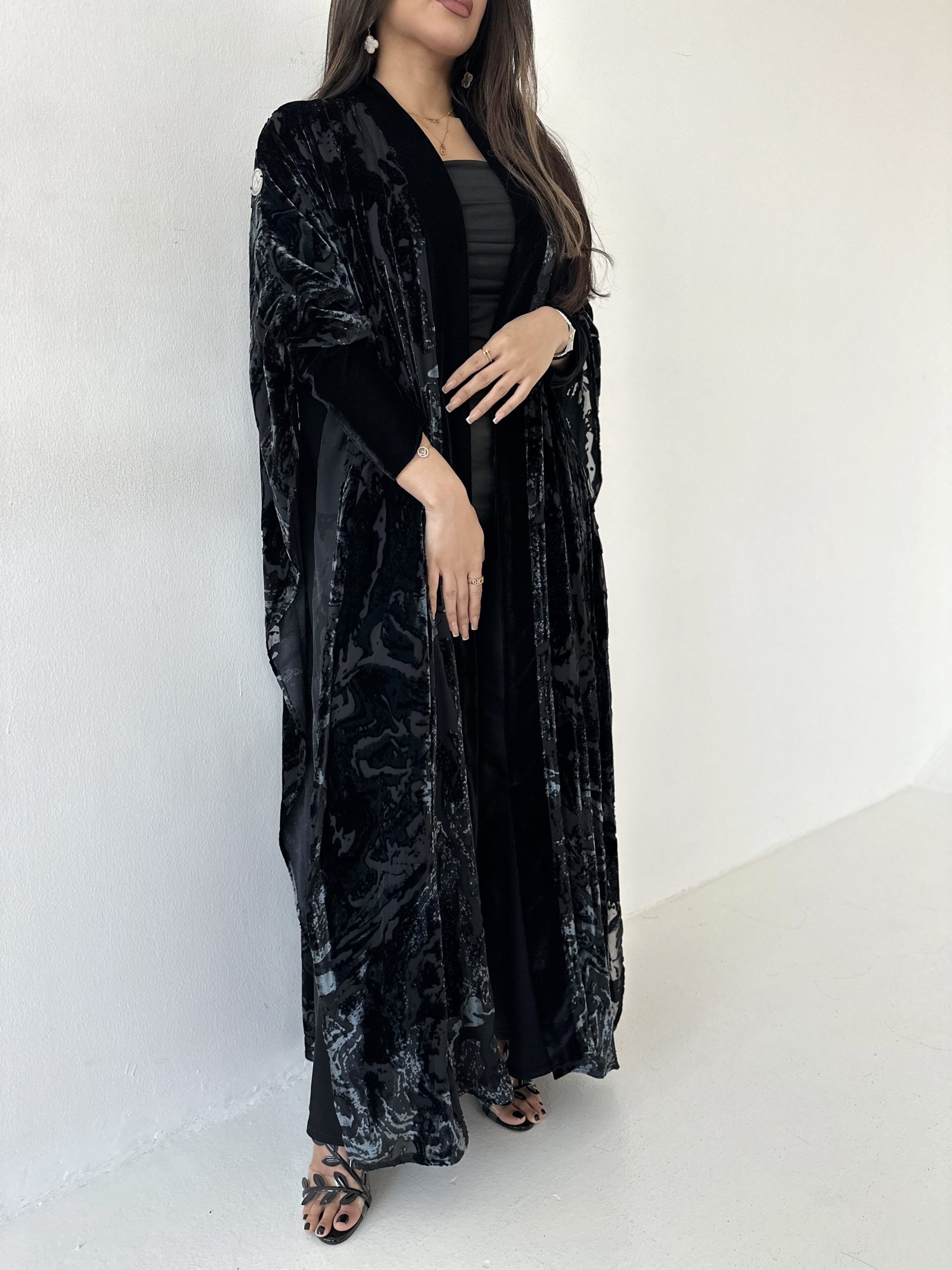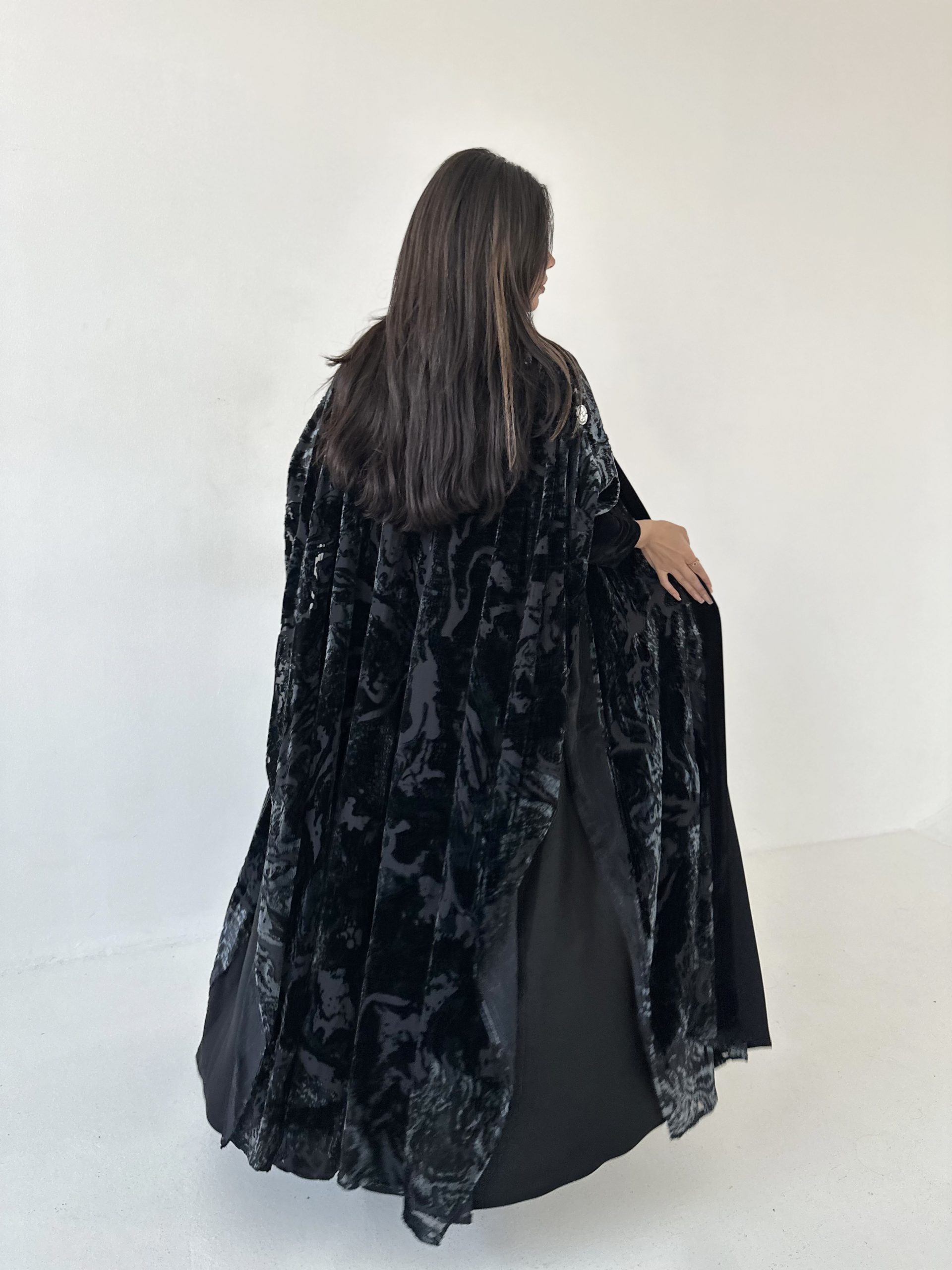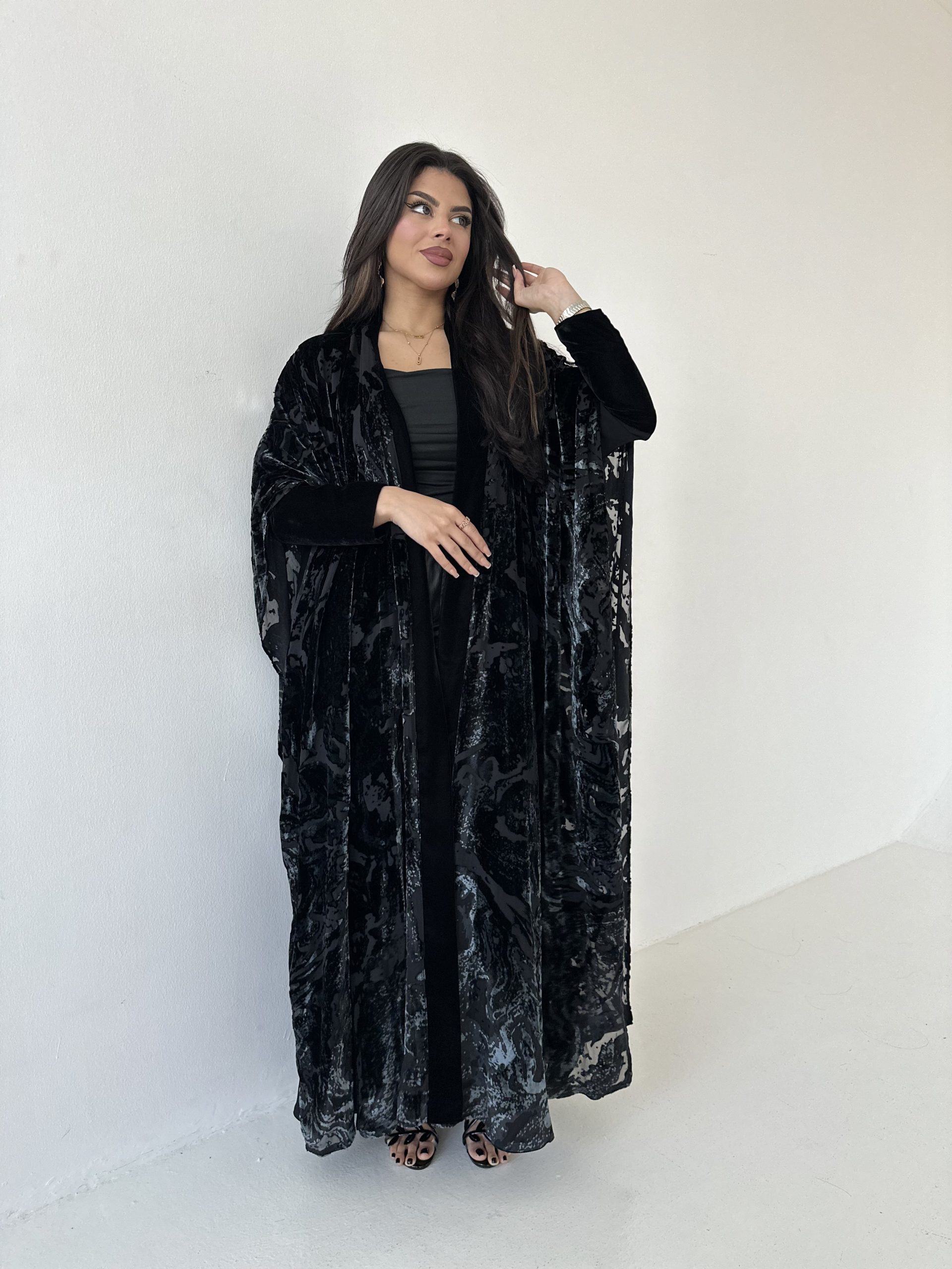 – العبايه قماشها كريب ناعم وفوقها طبقة شيفون منقش بمخمل